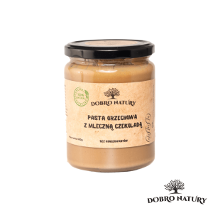 Pasta orzechowa z mleczną czekoladą to smaczny, pożywny i energetyzujący dodatek do codziennej diety, który dostarcza organizmowi wiele wartościowych składników odżywczych. Jednak zaleca się spożywanie jej w umiarkowanych ilościach ze względu na wysoką zawartość kaloryczną. Czekolada, zwłaszcza mleczna, jest znana z tego, że poprawia nastrój dzięki zawartości serotoniny i endorfin. Spożywanie naszej pasty orzechowej z dodatkiem mlecznej czekolady może przynieść chwilę przyjemności i relaksu, pomagając zredukować stres i poprawić samopoczucie. Połączenie białka i zdrowych tłuszczów z orzechów oraz węglowodanów z mlecznej czekolady sprawia, że nasza pasta jest idealnym źródłem długotrwałej energii. Świetnie sprawdza się jako dodatek do śniadania, przekąska przed treningiem lub słodka uczta po posiłku. Pasta orzechowa z dodatkiem mlecznej czekolady to wyjątkowe połączenie kremowej konsystencji orzechów z aksamitnym smakiem mlecznej czekolady. Każda łyżka tej pasty to prawdziwa uczta dla podniebienia, która zadowoli zarówno miłośników orzechów, jak i czekolady.