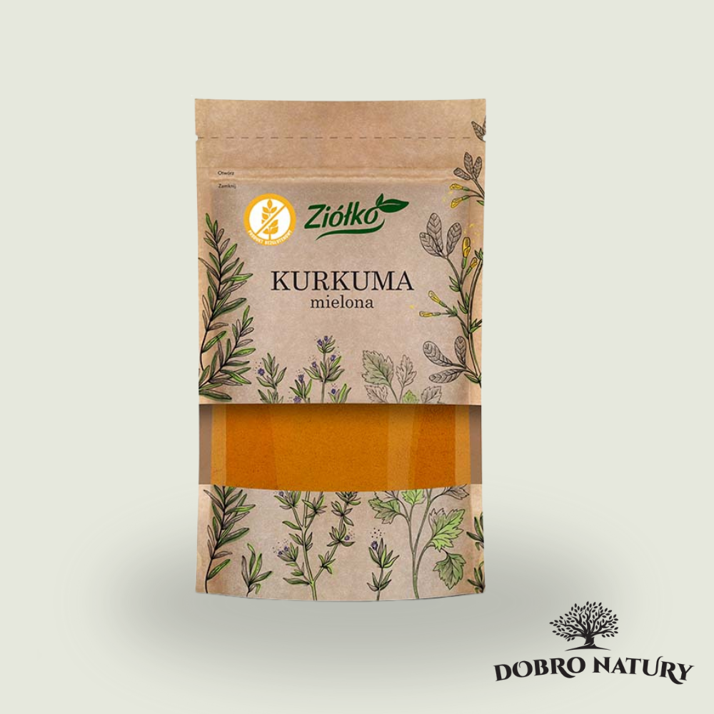 Kurkuma mielona Ziółko 60 g – bezglutenowa przyprawa o złocistym kolorze i korzennym smaku. Idealna do curry, zup, sosów i napojów zdrowotnych.